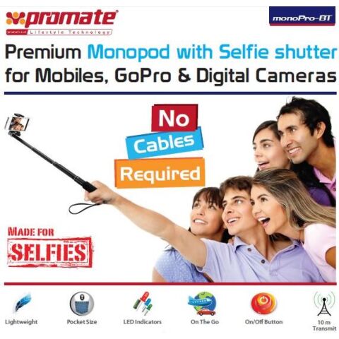 Promate monoPro-BT Premium Monopod with Selfie shutter for Mobiles, GoPro & Digital Cameras.-With monoPro-BT, take great selfies with your smartphones, cameras and GoPro. Take amazing selfies on just one click with the selfie shutter and click picture without even setting the self-timer in your device. monoPro-BT will prove to be your best companion whilst you make memories of a lifetime. So just go ahead and take those perfect shots with monoPro-BT.