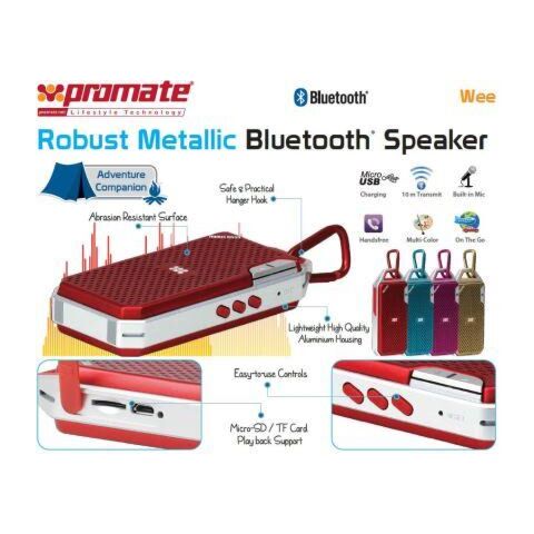 Never compromise sound quality for portability. Introducing the all new Promate Wee Robust Metallic Bluetooth® Speaker , a wireless ultra-portable speaker. Even with its compact and portable size the speaker delivers a supreme base sound output and yet can easily clip onto your backpack. You can wirelessly stream audio from any Bluetooth® equipped mobile device or even play your favourite MP3/WAV tracks using the on board TF card reader. The Promate Wee can be used as a hands free device for answering calls too. All this encompassed in an abrasion resistant high quality aluminium housing. Making it an ideal audio solution for indoor or outdoor music playback.