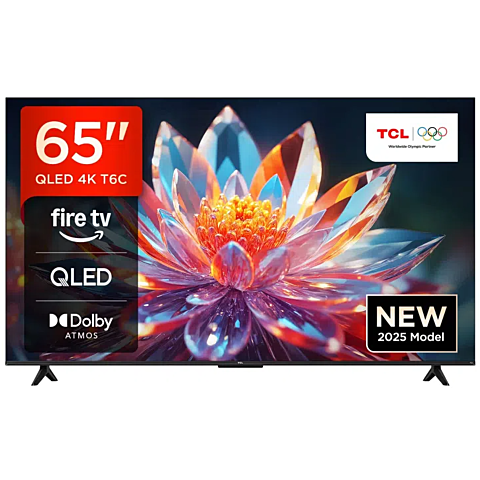 TCL 65 Inch T6CUK Series QLED 4K Google TV ? Resolution 3840 x 2160 4K UHD LCD QLED with VA panel, Refresh Rate 60Hz native, Dolby Vision HDR10 HLG, Color Gamut 93% DCI-P3, Contrast Ratio 6000:1, Brightness 350 nits typical. Audio 2.0 channel 20W with Dolby Atmos and DTS-X, Connectivity 3 x HDMI 2.1 (eARC & ARC), 2 x USB 2.0, Bluetooth 5.0, Wi-Fi 5, Operating System Fire TV OS 8. Dimensions with stand 1444 x 894 x 327 mm, Weight 16 kg with stand, Warranty 3 years.